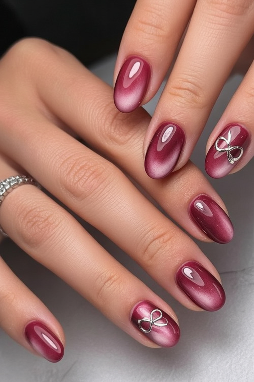 The average interpretation of a dark pink cat-eye is elegance, but tiny 3D bows insert a note of playfulness. Magnetic shimmer lends its luxurious touch while silver bows offer a tint of sweetness. This might well be feminine and polished at the same time-one to wear if you want your nail to double as an accessory.