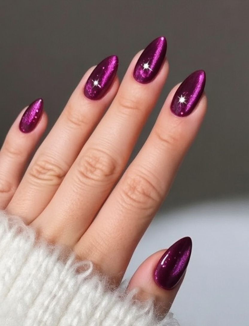 These cat eye nails in deep purple resemble a midnight sky scattered with tiny reflected stars. The shimmer is loud but elegant, instantly giving your hands that special glow without any Art. It has that cozy-yet-glam vibe perfect for the cooler months.