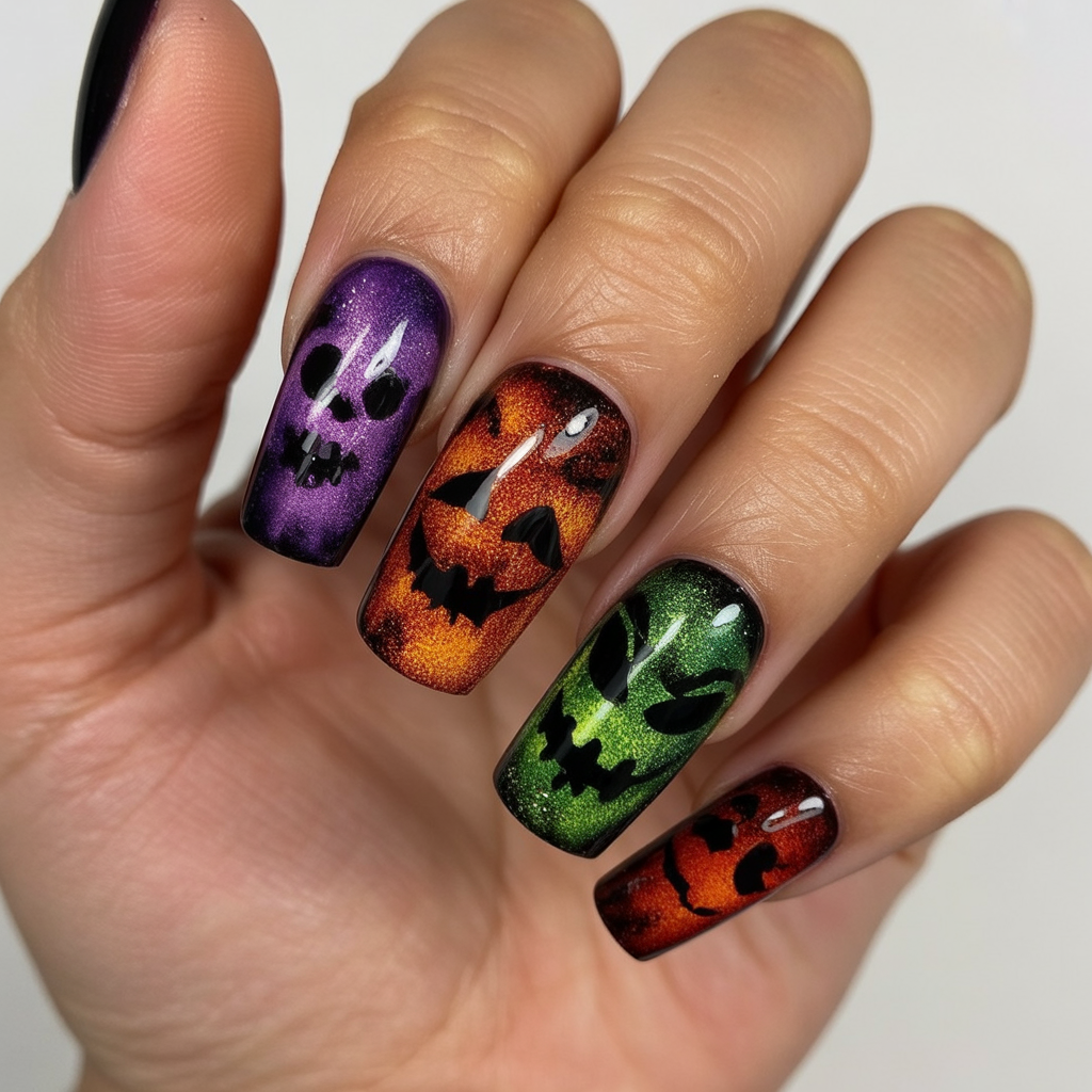 This set takes the spooky season and turns it into high-shine fun. Each nail glows in a different neon cat eye shade—purple, orange, green, and red—finished with grinning skull and pumpkin faces that look as if they’ve leapt right from a Halloween light show. Playful, bold, and full of personality: it’s like a party on your fingertips.