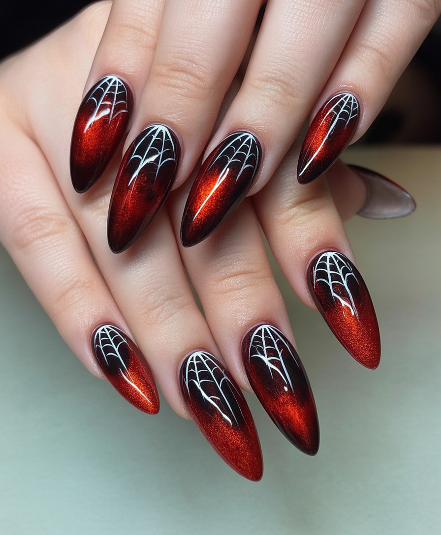 Equal parts edgy and chic, these red and black cat-eye nails with spiderweb accents are for all those who love designs that are a bit dramatic. The deep base creates intensity, while the white spiderweb art adds that gothic glamour. It’s playful enough for a themed night out but chic enough to carry you way beyond Halloween.