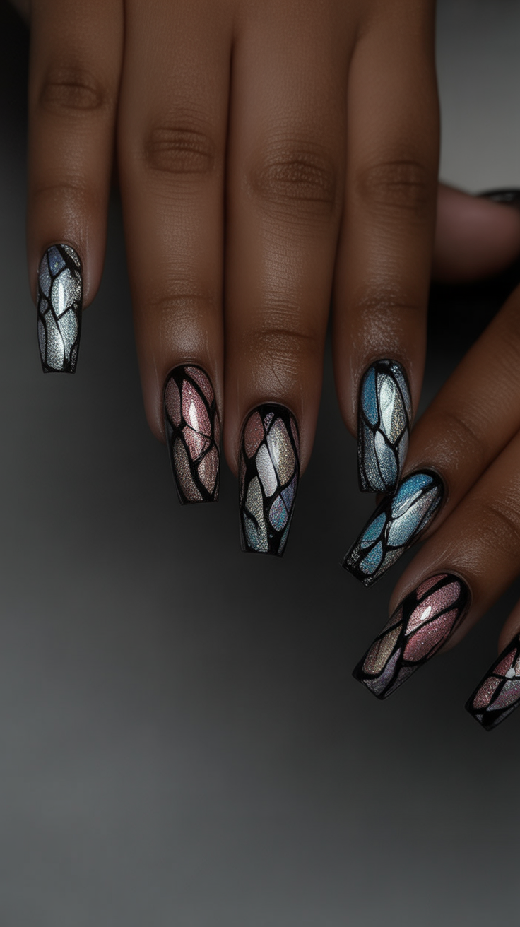 This set screams stained glass coming into being. Each nail divides into irregular sections of metallic cat eyes bordered in black to create an artful mosaic. It is vibrant without almost childish, and each color shift adds an element of drama.