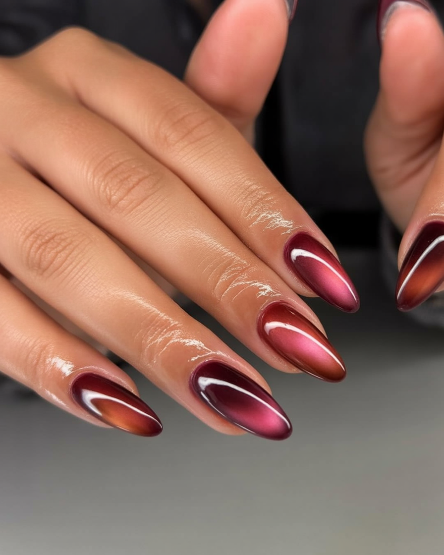 These burgundy cat eye nails look almost like molten velvet, shifting between red and wine tones with a subtle glow. The deeper edges give a softly smoked effect, making the fingers look elongated and elegant. It’s dramatic, but in that quietly confident way.