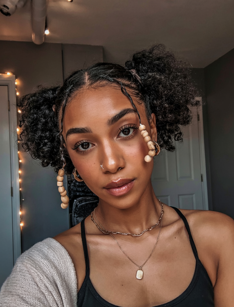 Whimsical, fun, and full of character — this double puff style brings out a youthful glow no matter your age. The beads on the tendrils add a charming, playful vibe, and the middle part gives structure and symmetry to the look. It’s giving 90s nostalgia with 2025 flair.