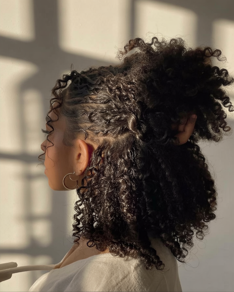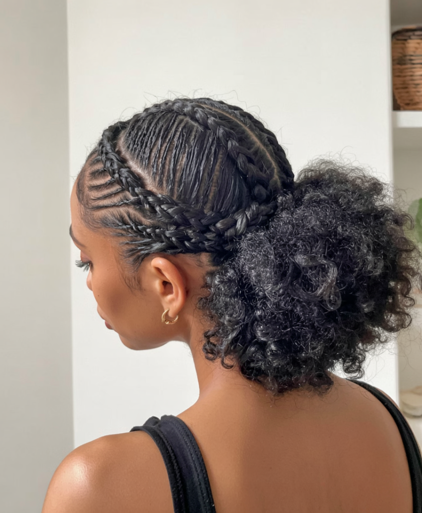 If you’re looking for a protective style that still lets your curls shine, this one’s a winner. It’s especially great for those with a busy routine — the cornrows minimize daily styling while the puff allows for natural volume. Pair with a satin scarf at night to keep it fresh and frizz-free all week.
