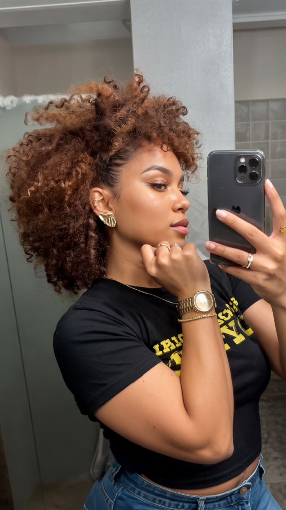 This warm, auburn style adds spice without sacrificing simplicity. The high crown and tapered sides create a gorgeous silhouette that’s equal parts edgy and elegant. It’s the kind of look that makes you fall back in love with your curls.