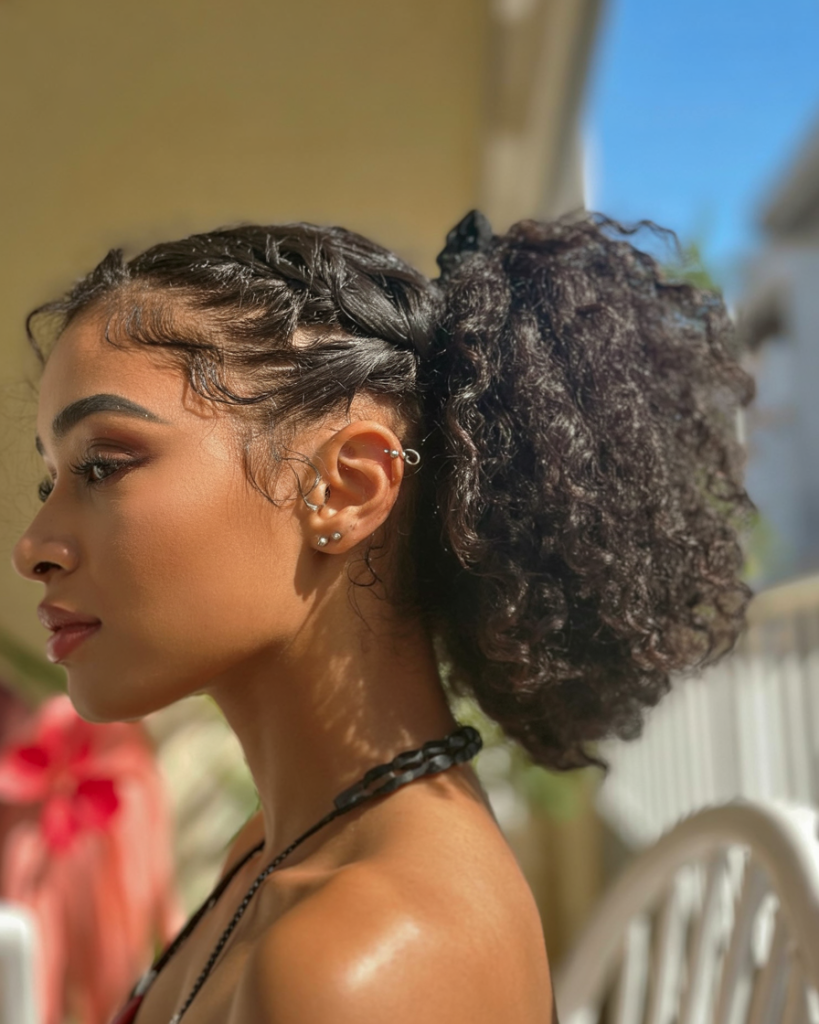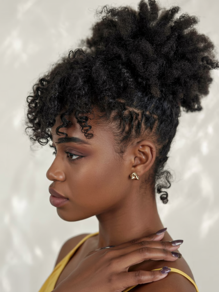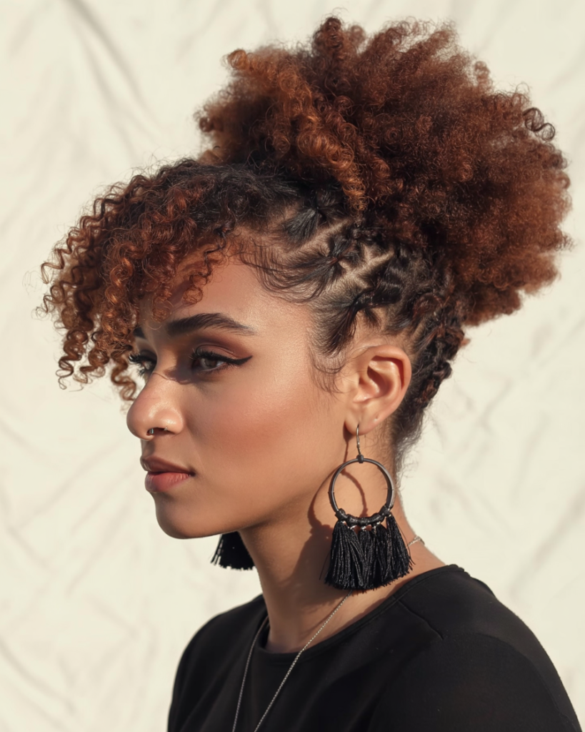 This style practically radiates sunshine. It’s playful and sculptural with sweet curly bangs that soften the face. The mini braids at the sides add visual interest and a modern edge, making this high puff anything but basic.