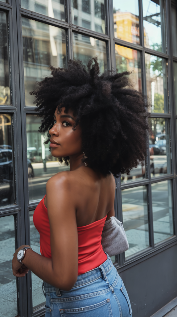 City streets, bold walk, full confidence — this voluminous afro is a power move all by itself. The intentional shape creates lift and body that commands attention, while keeping the natural movement of the coils intact. It’s the kind of hair that starts conversations.