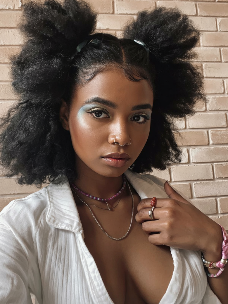 This four-puff look is equal parts bold and adorable. The symmetry is clean and structured, but the puffiness keeps it playful. It’s the kind of hairstyle that makes even a tank top feel like a fashion statement.