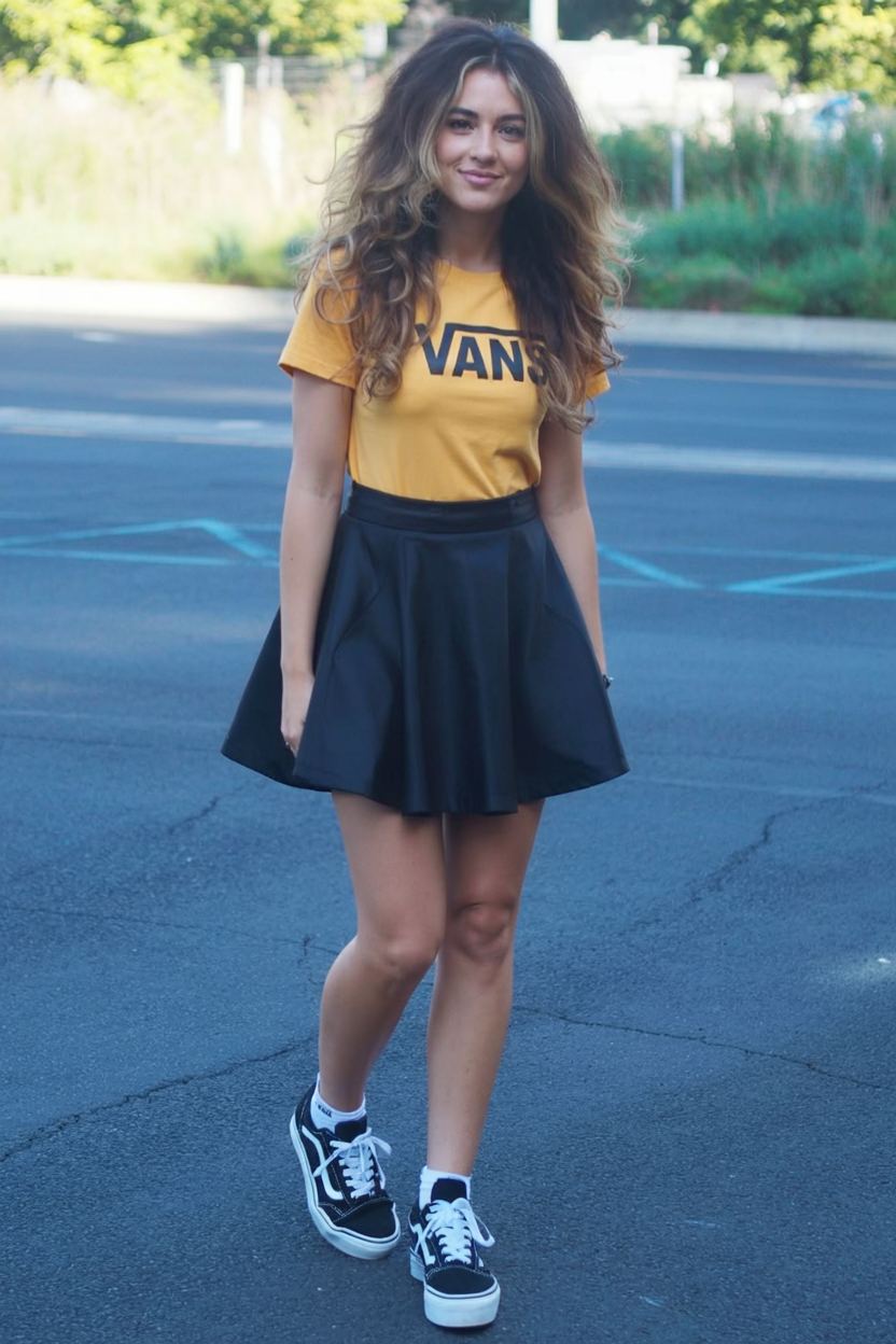 This one’s for the cool girls who don’t try too hard. A bold yellow graphic tee tucked into a classic black skater skirt makes a statement without overthinking it. Add Vans, and suddenly you’re ready for class, lunch break, and an impromptu hangout after school.