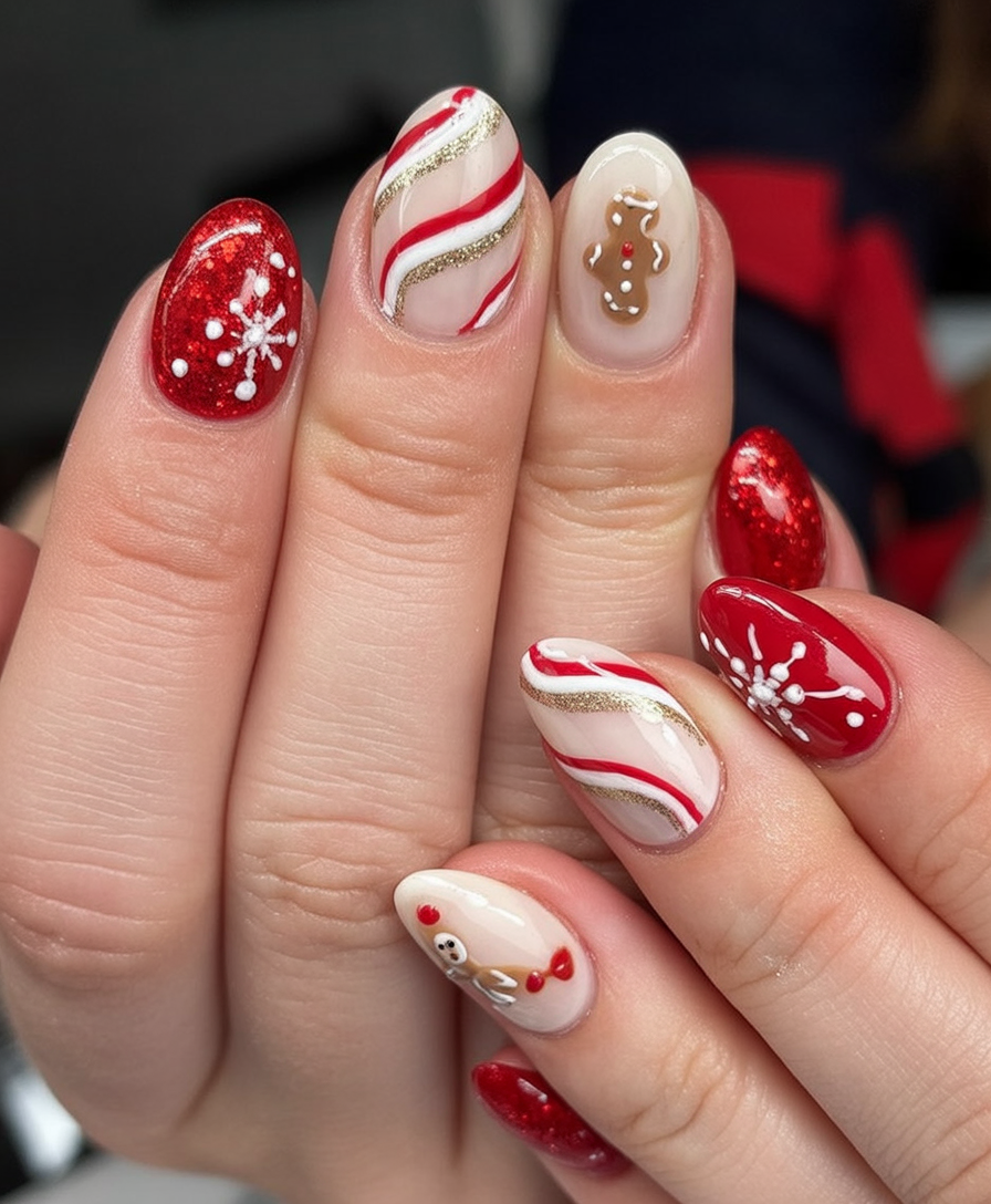 A holiday baking inspired mani featuring candy cane swirls, little gingerbread cookies, and deep red Glitter all packed inside an almond shape. Each nail tells its own little tale, yet the color palette keeps everything together and cute. It’s playful but not over-the-top, like something you’d wear while frosting cookies for friends.