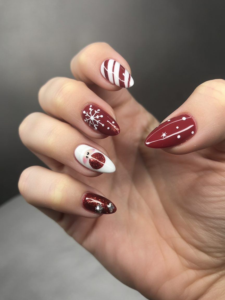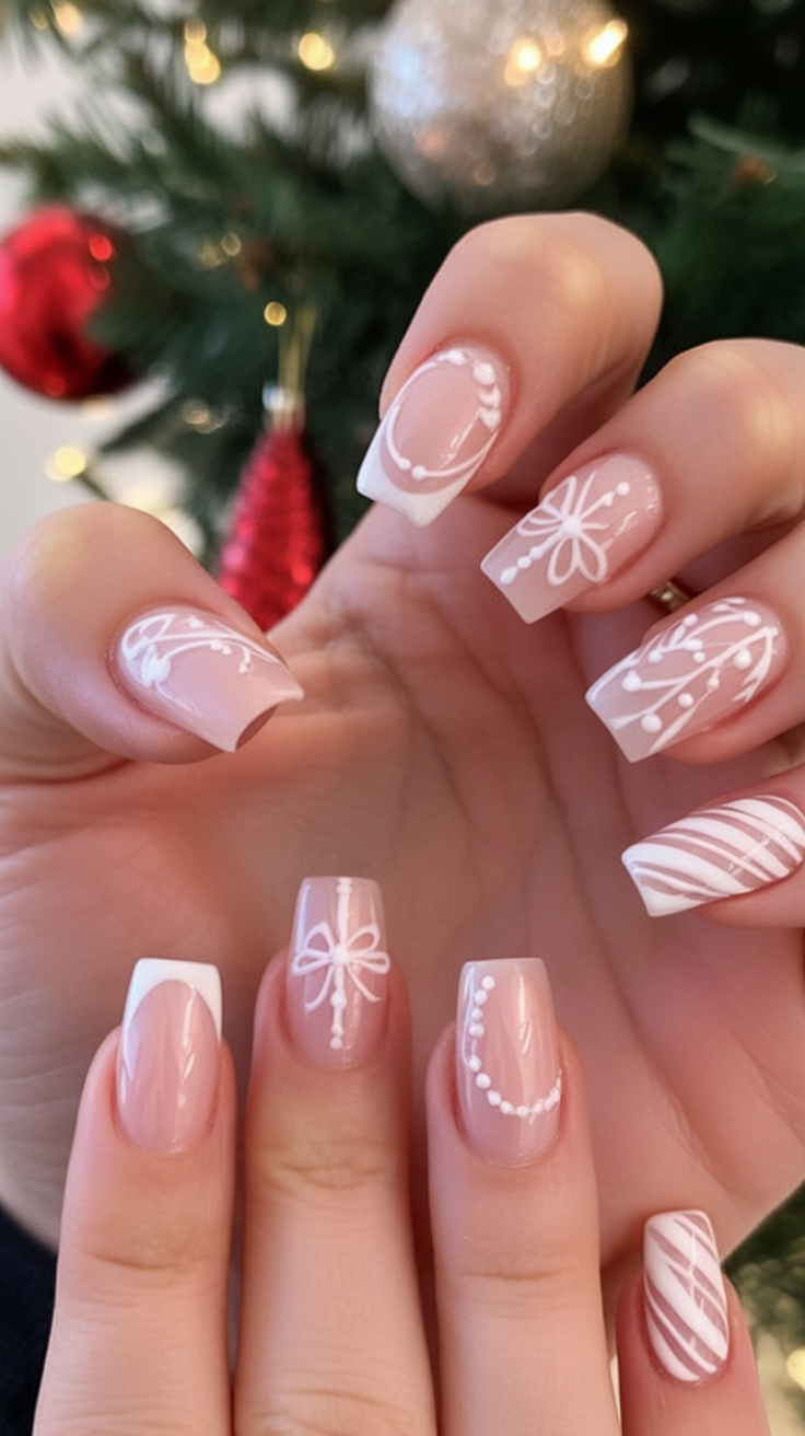 Soft blush nails with fine white bows, garland dots, and ribbon-like stripes feel fresh, feminine, and subtle. The look is almost like gift wrap done in whisper tones—dainty and elegant rather than bold. It’s a quiet festive nod for someone who prefers minimal color with soft detailing.