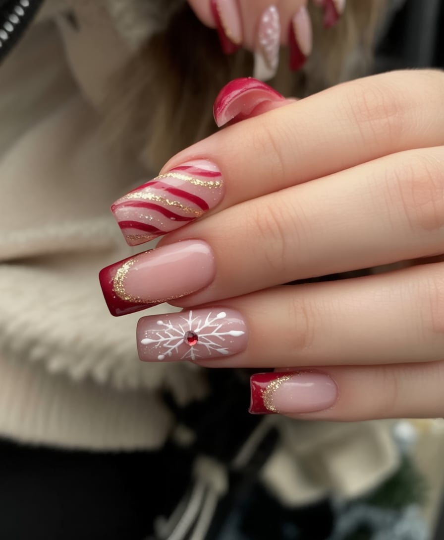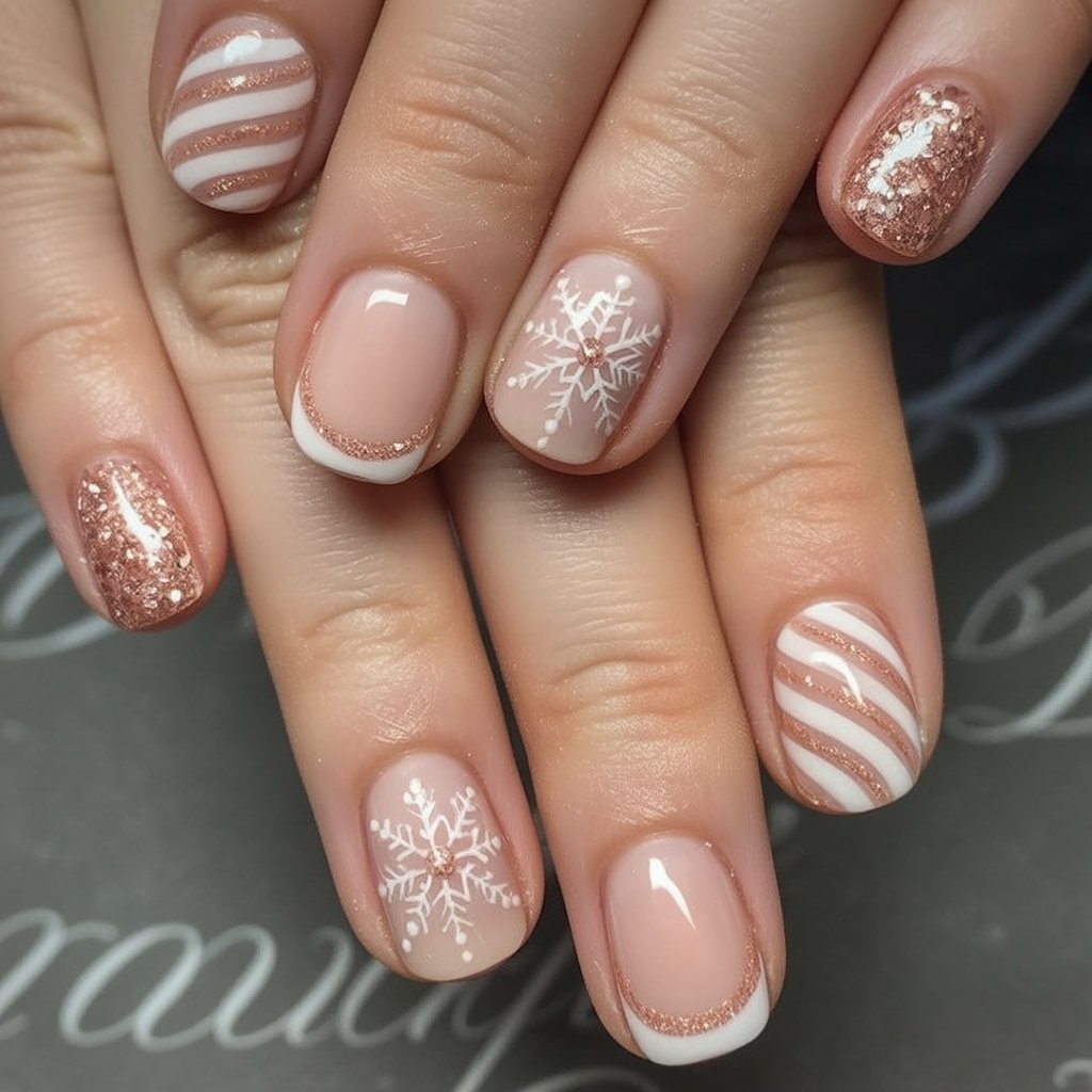 Short gently rounded squares with a rosy nude base; one nail glitters, another bears a petite snowflake, and a subtle candy-cane stripe ties it all together. It is quiet and pretty- like rose Gold ornaments on a bare-tree. Festive and very much wearable for daily errands or office days.