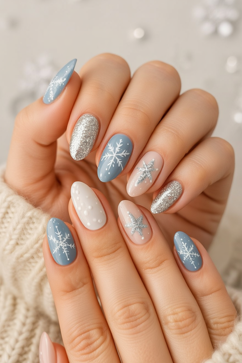 Soft Blue meets milky nude and silver Sparkle in a cozy, winter-sky palette. A few delicate snowflakes and raised dots add quiet texture, like frost on a windowpane. It’s festive without being busy—calm, cool, and just whimsical enough for December brunch dates and evening cocoa runs.