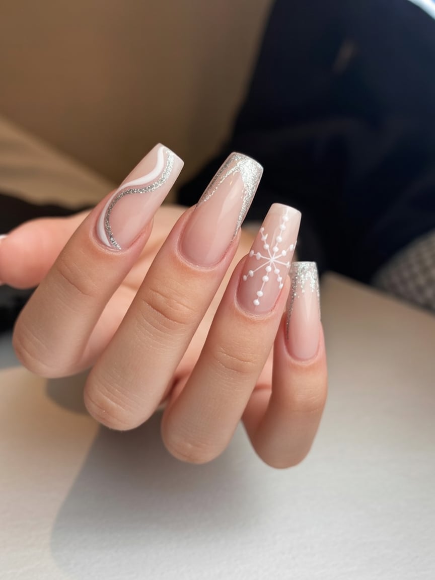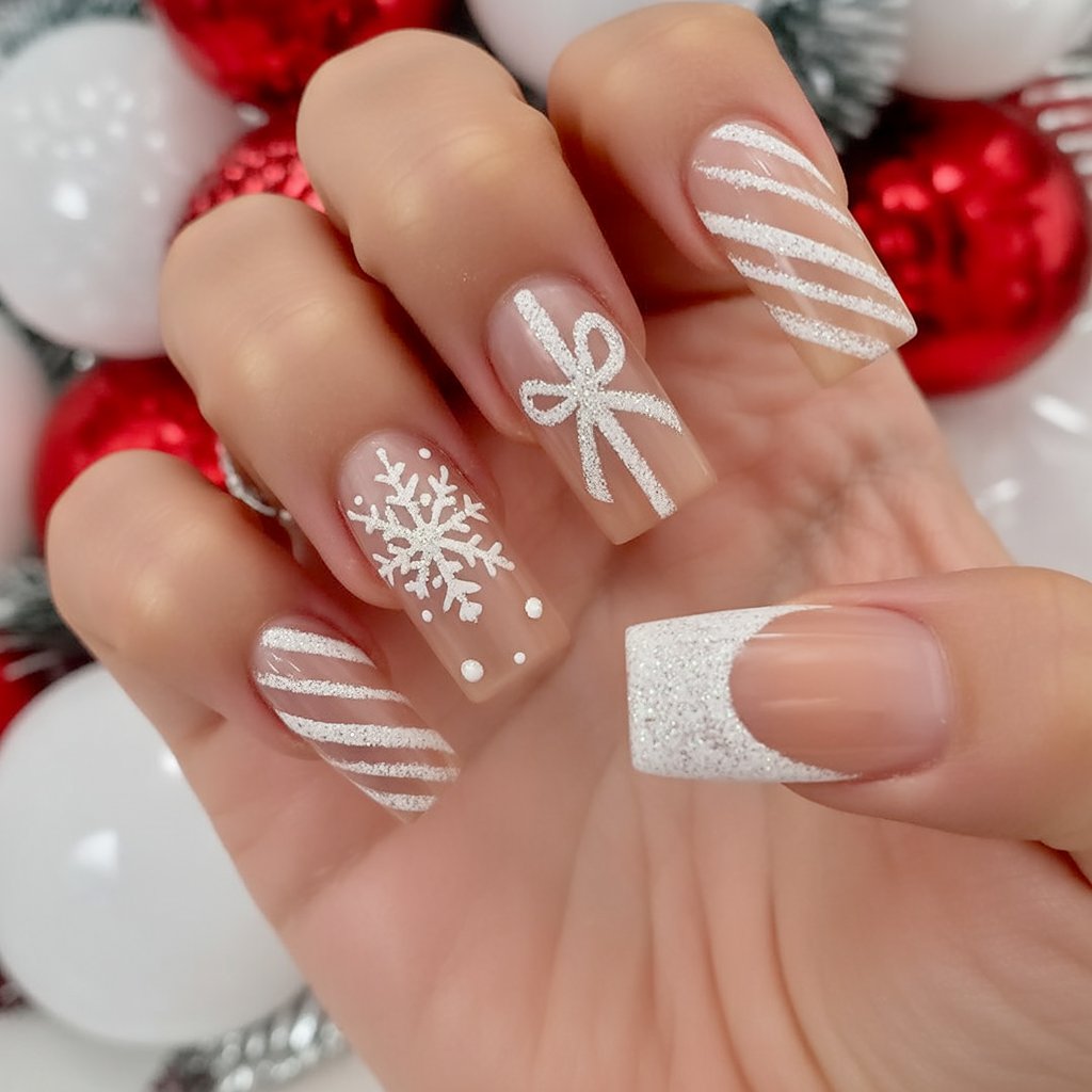 This set mixes delicate silver lines, snowy French tips, and a minimalist snowflake over a sheer nude base. It has the softness of winter light and the polish of a holiday party manicure without any heavy detailing. Feminine, airy, and gently festive.