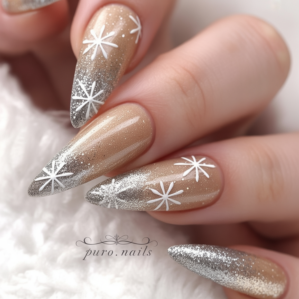 A wash of champagne nude fades into an ocean of silver sparks, starbursts thin and slim creating those wintry and classy vibes. The gradient glows dimly, as though twinkle lights were seen through a frosted window, thus keeping a low-key ambiance but still able to attract attention. It is for the minimalist who wants a hint of holiday Glitter.