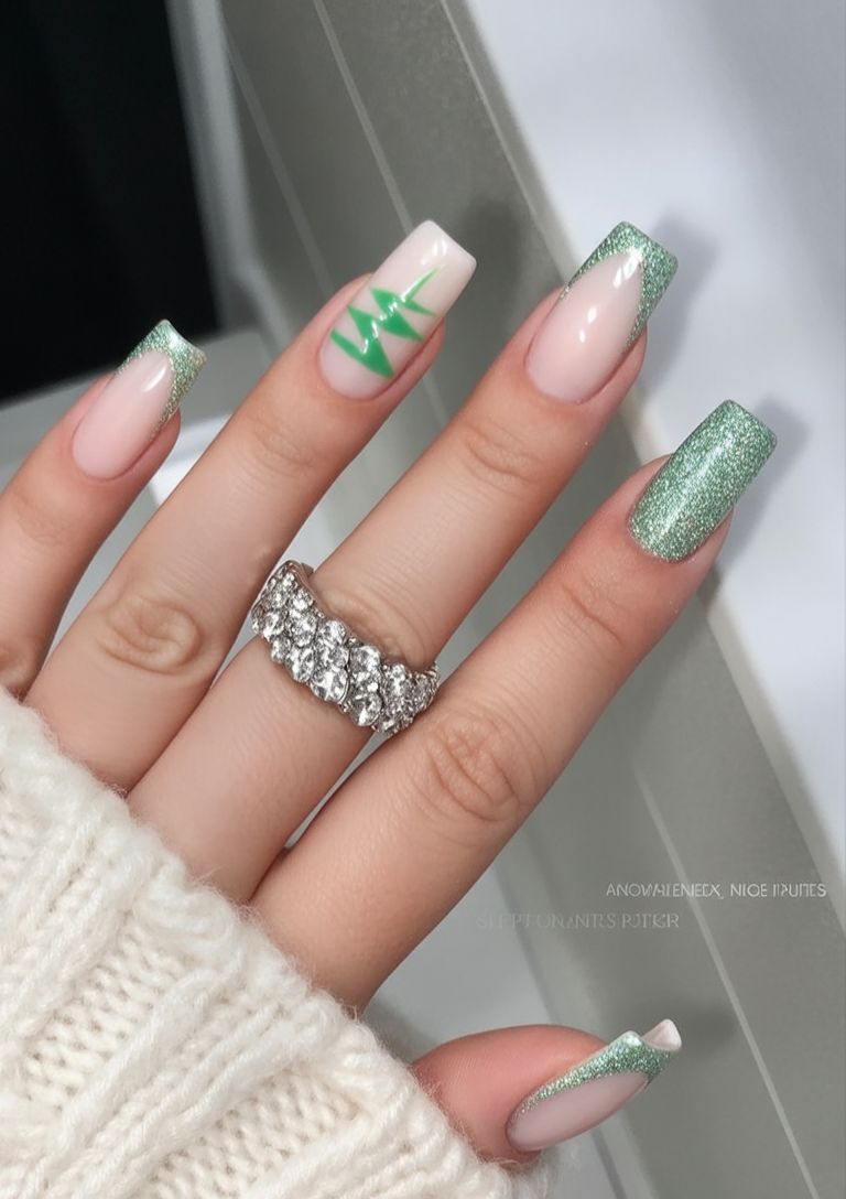 Fresh and modern: Soft nude nails with minty green shimmer tips and one tiny zigzag tree. In the simplest way, akin to a Nordic candleholder on a clean mantle, it is festive. Green keeps things seasonal, but negative space feels very chic and breathable.
