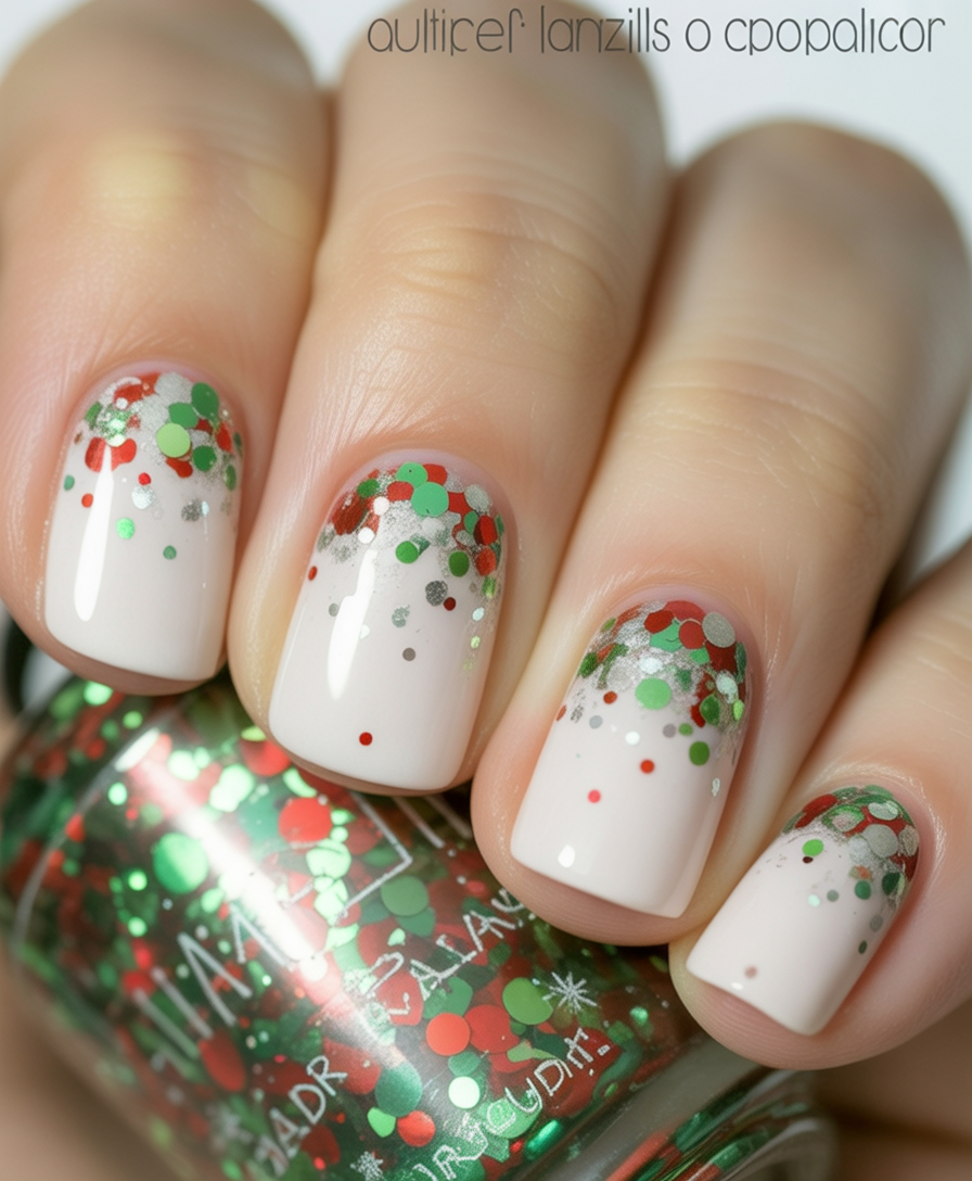 A barely-there nude base sprinkled with soft festive confetti—red, green, and silver dots that drift from the cuticle like champagne bubbles. It’s cheerful yet restrained, giving you that party mood without sacrificing subtlety. Perfect if you want a hint of holiday color that still reads simple and polished.