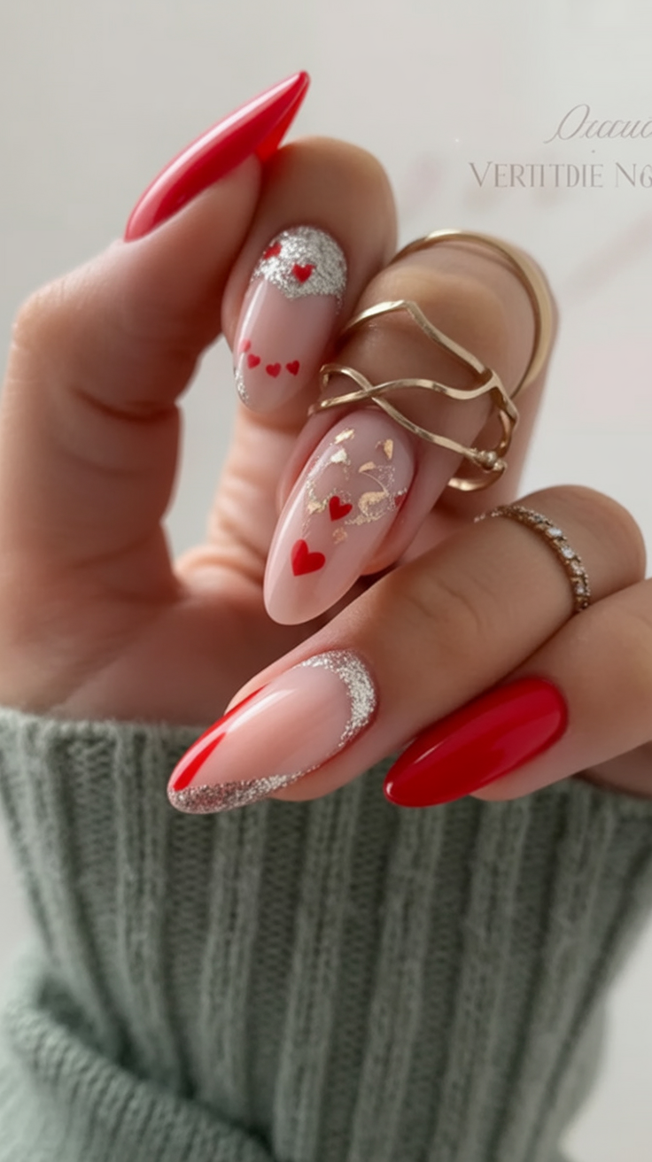 In this manicure, soft nude is mixed with red French tips coated with silver glitter, tiny hearts sprinkled like confetti. Cozy and romantic- think twinkle lights, velvet dresses, and long nights by the fire. The shimmer brings a wintery vibe without taking away from the design.