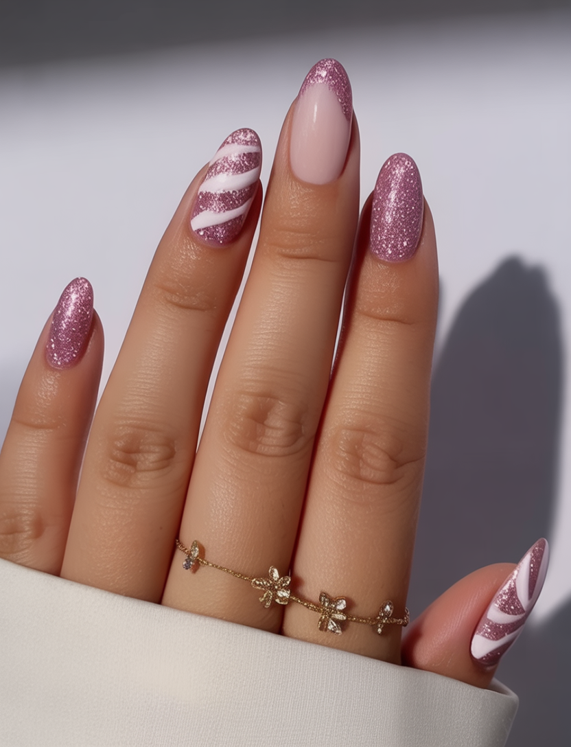 This type of manicure softly whispers festive rather than scream. The muted blush base has fine glittering spread off over the almond tips, while two nails feature a gentle candy-cane swirl, with the emphasis on chic over kitsch. The shimmer catches the light just right – like snow on a golden hour – pretty, classy, and playful just a little. These are the nails for someone whose holiday vibe is cashmere sweats and rosy lipstick while keeping it simple and grown-up.