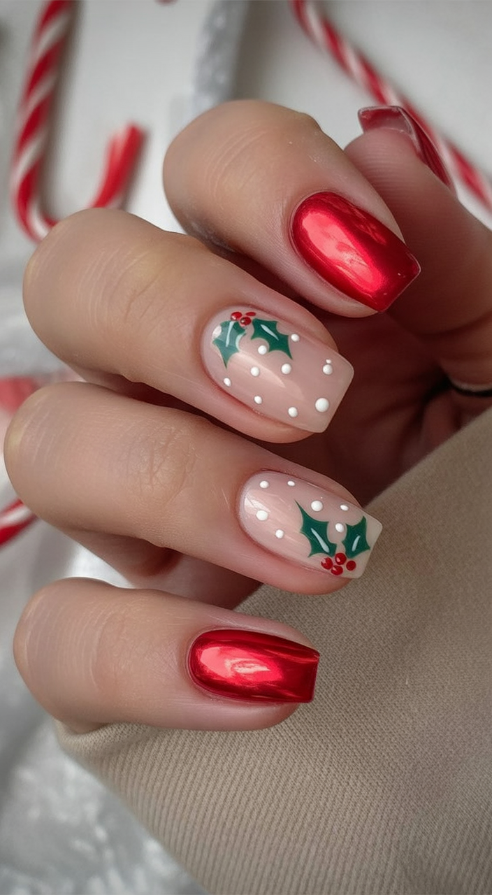]- Classic red chrome nails with holly sprigs over nude base gives these festive colors a fresher perspective. The soft dots and leaves provide just enough detail to lighten the mood from all too explicit. So it is your typical green-and-red, sleek and elegant.