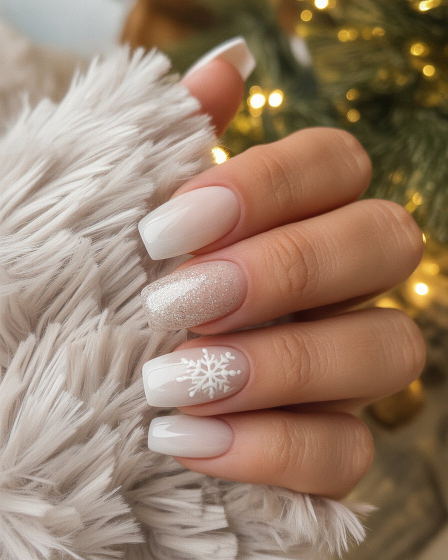 Sliding from a soft white onto a nude base is accentuated by one nail covered in Glitter and a subtle snowflake. The style looks like frosted glass bare minimal sunlight in winter-the whites are cool, clean, and refined. It offers a festive air with no colorfulness, so it is versatile.