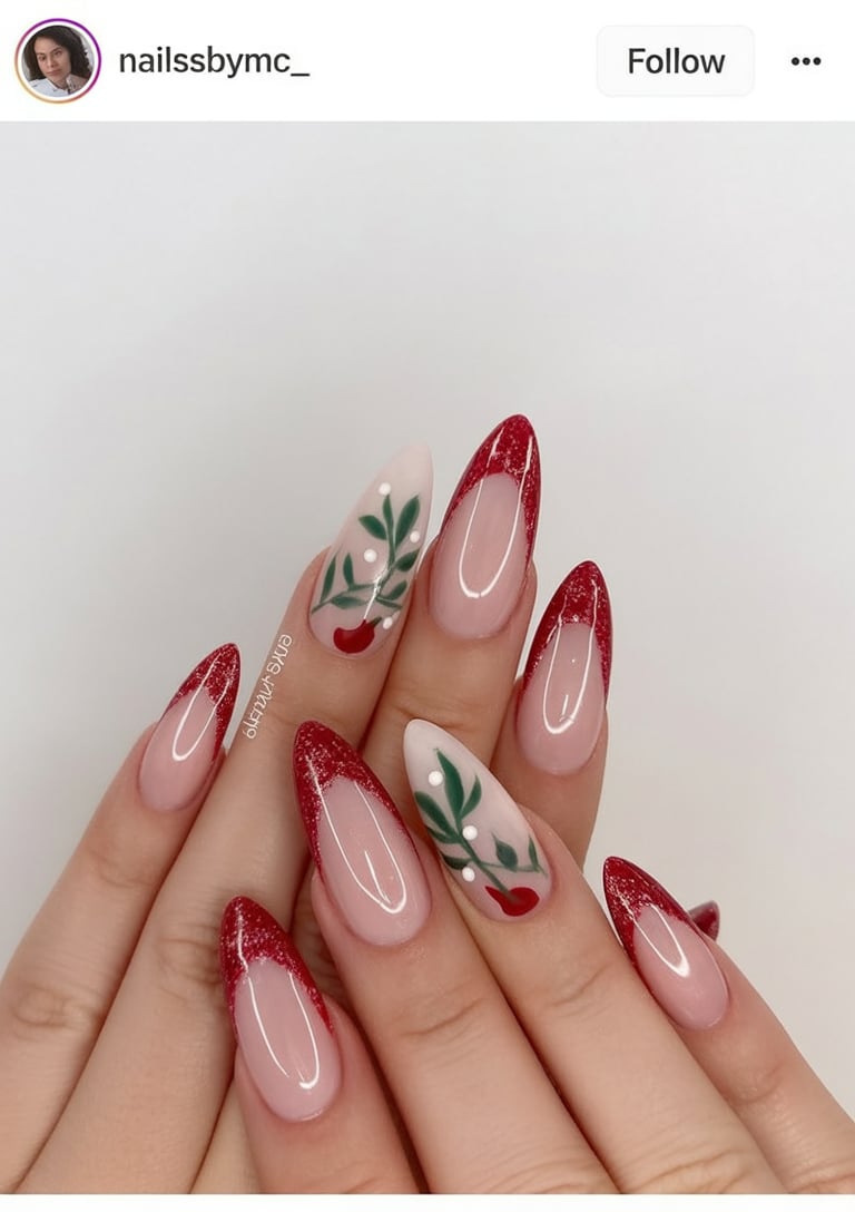 Sheer nude nails with slender red Glitter tips, then one or two nails with tiny mistletoe sprigs. It’s romantically subtle-fast for being festive, if you know what I mean. This says Christmas in color for those who usually stay pretty neutral but want the slightest bit of sparkle around December.