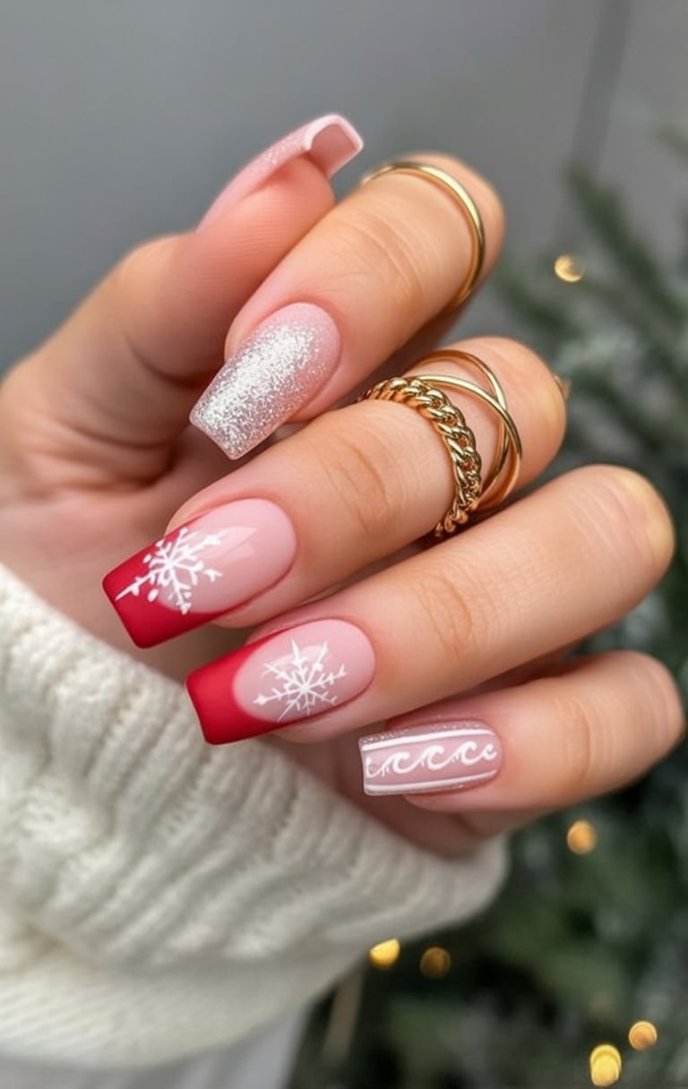 There is just something truly elegant yet frozen-in-time glorious in mixing something bold with softness. This would beautifully be fulfilled by the red French tip, subtle nude polish, and delicate snowflake Art. The combination of three finishes, shimmering, matte, and glossy, lifts the look into an elegant grave without reaching mainstream overexposure. These sorts of manicures make you want to wrap up presents by the fireplace or recycle mulled wine in a comfy sweater.