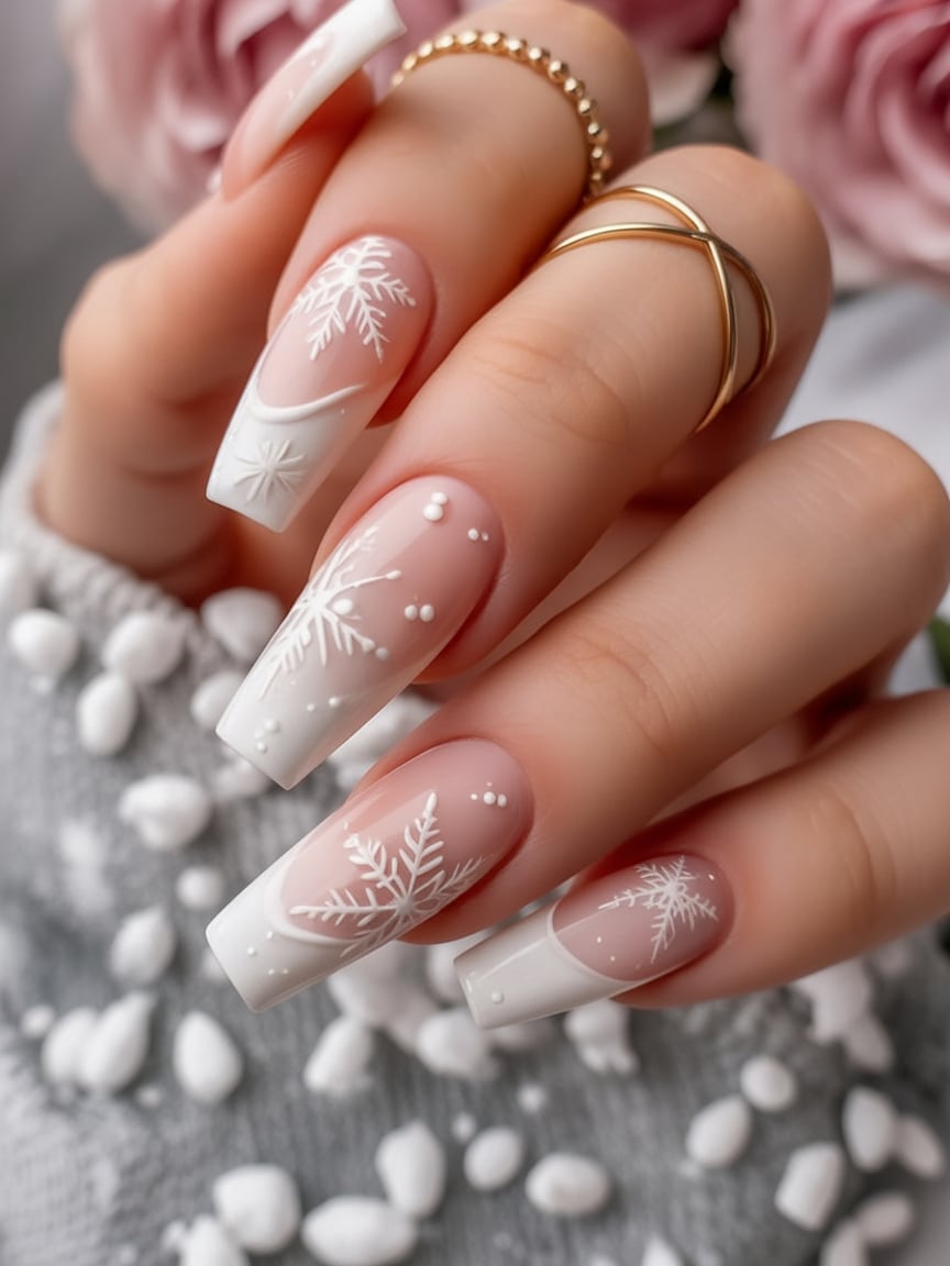 Picture the first-old soft snow on a quiet morning: soft milk-tinted French tip decorated with delicate snowflakes gliding on a nude barely-there base. The look is clean, luminous, and camera-ready just what you want for a holiday polish that spans chunky knits and satin blouses. Festive yet so discreetly polished vibe going on there.
