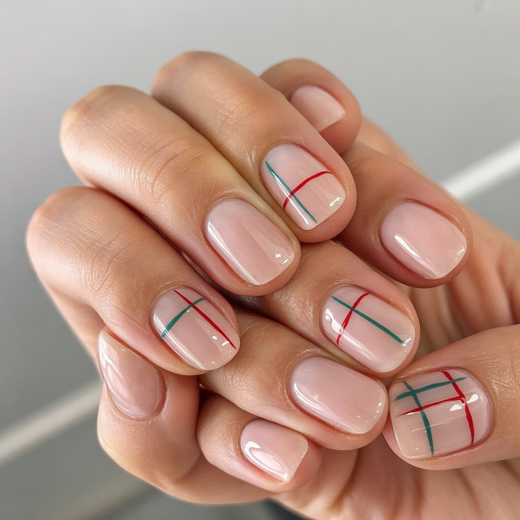 Clean, glossy nude nails get the slightest nod to the holidays with fine plaid lines in green and red. It’s chic, airy, and looks effortlessly polished without a speck of Glitter. Like a cozy scarf pattern turned into manicure form, but toned down for everyday wear.