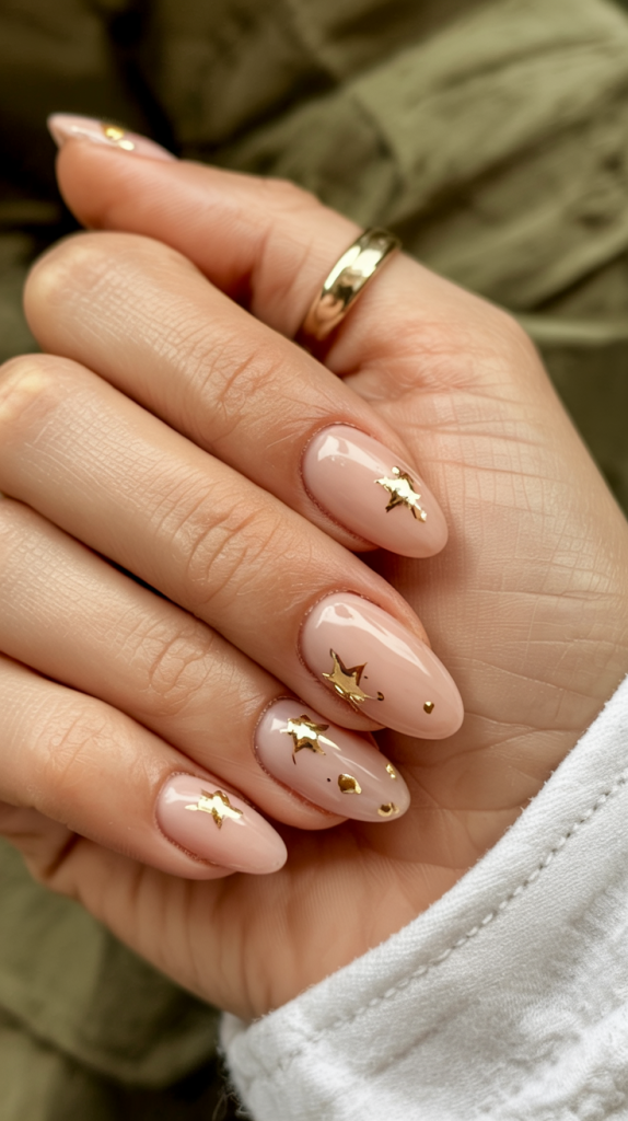 This minimalist fall look is all about quiet luxury. The deep brown with the nude make a warm and pleasant color scheme, as if one were having a mocha at a window, as the fall gold turns outside. The delicate gold starburst decals are an almost perfect accessory to your tips of the fingers – elegant, delicate and a tease of glitter.