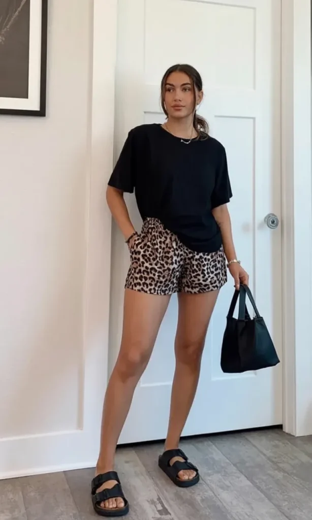 This outfit is proof that a little animal print can wake up the simplest basics in the best possible way. A plain black tee on top keeps things clean and grounded, but the leopard shorts bring in that fun, slightly bold personality that makes the whole look feel styled instead of forgettable. It is easy, modern, and a tiny bit edgy without being difficult to wear. If your summer wardrobe starts feeling too safe, this kind of combination is a great way to shake things up while still staying comfortable.