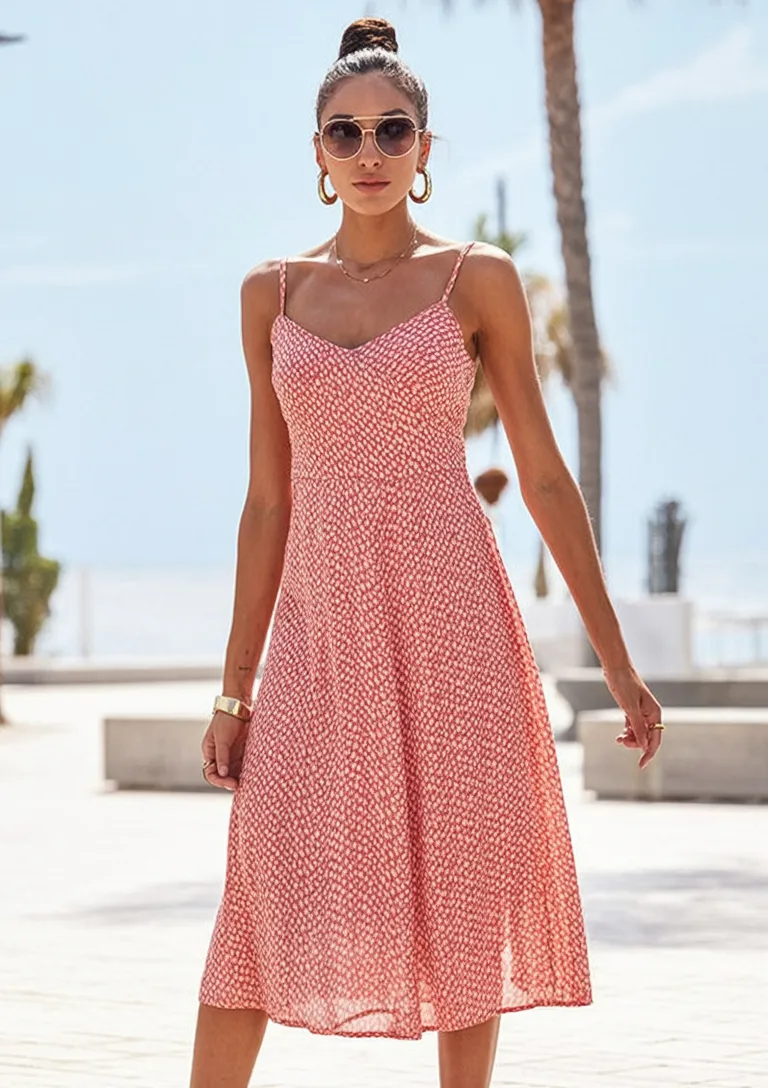 What makes this dress special is how naturally flattering it is. The neckline opens up the upper body beautifully, while the soft waist and flow through the skirt make it comfortable in the heat. It works especially well for women who love dresses that feel gentle and forgiving rather than overly structured. Pair it with a pink bag, simple sandals, and delicate jewelry for a pretty daytime look, or add a denim jacket if the evening cools off. For floral dress ideas in 2026, this one feels classic in the most reliable way.