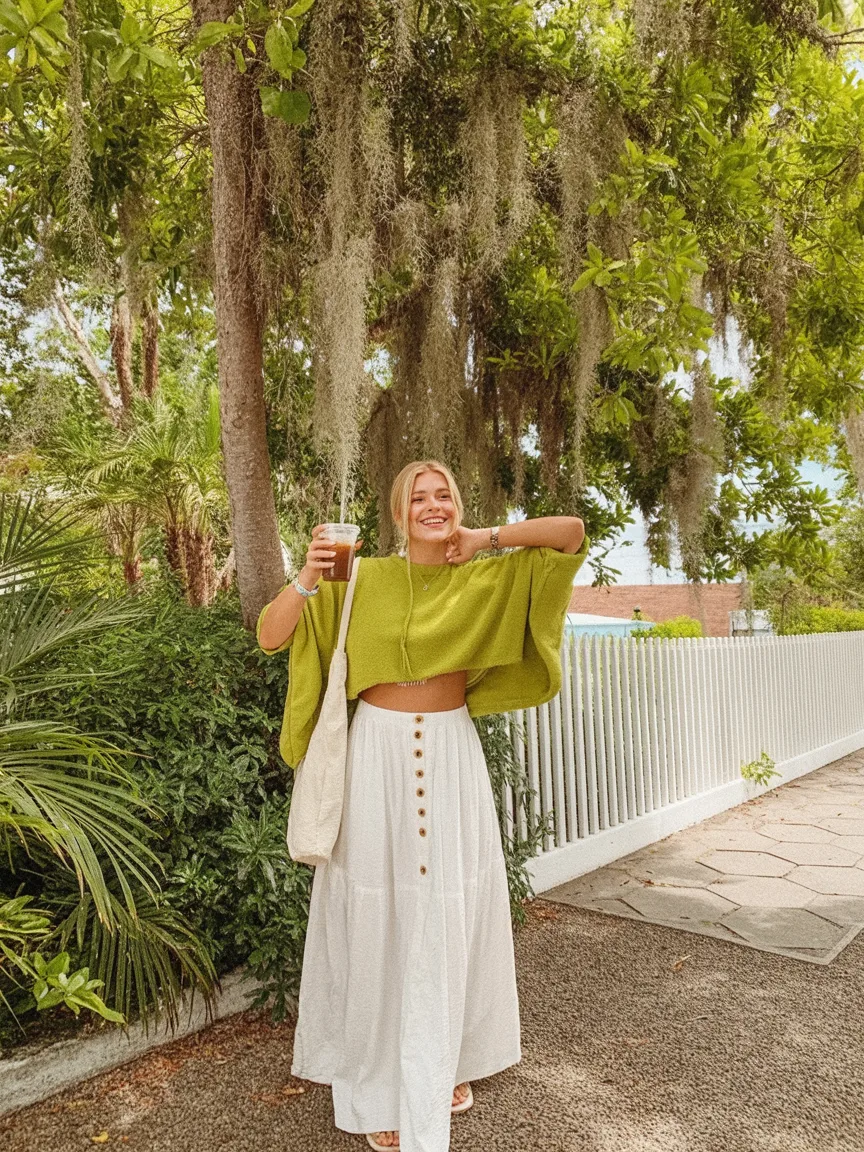 Now this is the kind of outfit that makes summer feel alive. The bright green cropped top has such a cheerful, sunlit personality, and when you pair it with a flowing white maxi skirt, the whole look feels breezy, optimistic, and a little artistic. It is bold without being loud, and that is a lovely place to be style-wise. There is movement, contrast, and a sense of ease that feels very 2026—less stiff perfection, more expressive comfort. This is the kind of look that turns an ordinary coffee run into a full mood, and honestly, I love clothes that can do that.