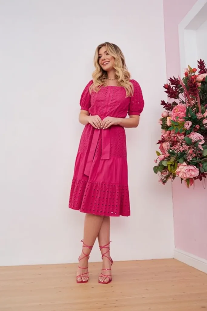 This bright pink midi dress is one of those pieces that instantly lifts your whole presence. It is polished, feminine, and just dramatic enough to feel special without becoming difficult. The eyelet texture adds that lovely touch of detail we all appreciate when we want a dress to do a little more, and the defined waist keeps the silhouette flattering and timeless. I love how it manages to feel classic and expressive at the same time. For summer clothes in 2026, dresses like this are such smart wardrobe heroes because they carry you beautifully through events without much styling stress.