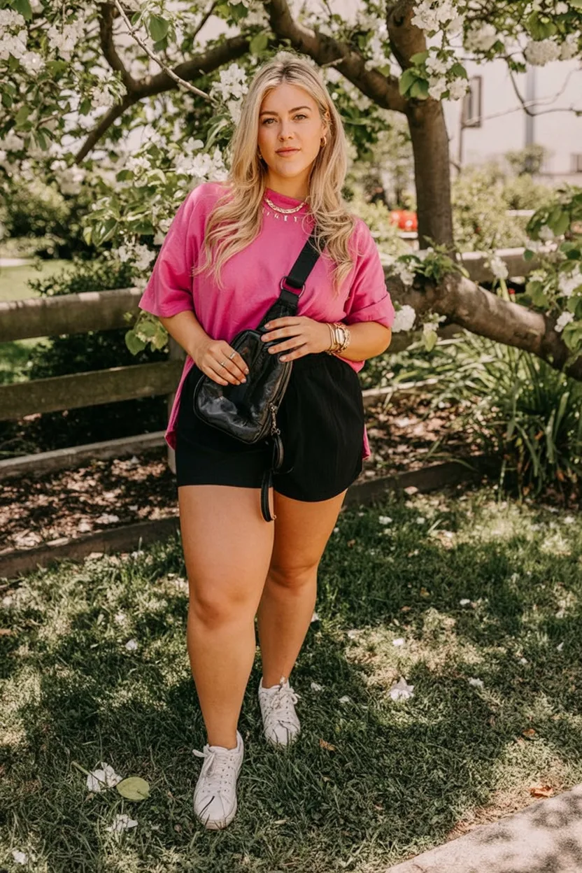 This outfit is such a good reminder that summer style does not have to be complicated to look great. An oversized bright tee with fitted biker shorts has that cool, off-duty confidence we keep seeing everywhere, and it works because it feels real. It is comfortable, sporty, and still totally stylish—basically what many of us want from everyday dressing when the temperature climbs. The pop of pink keeps it cheerful, while the streamlined shorts ground the look so it feels modern instead of sloppy. For women who want summer clothes in 2026 to feel practical and current, this is a strong yes.