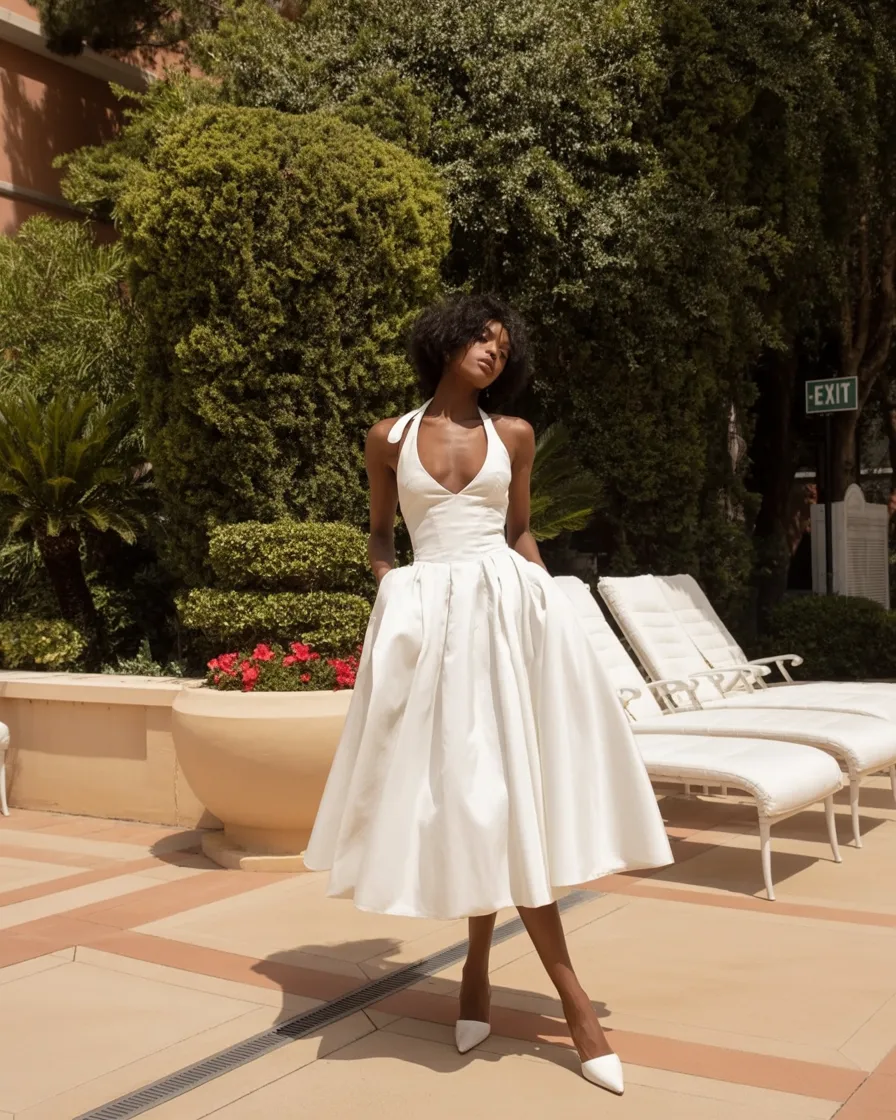 This dress is pure elegance with a little cinematic drama, and I mean that in the very best way. The halter neckline, the full skirt, the crisp white fabric—it all feels polished, feminine, and unforgettable without becoming too precious. It has that rare quality of looking both classic and striking, like something you would wear when you want the room to notice your style before you even say a word. For summer clothes in 2026, this kind of refined silhouette feels especially refreshing because it leans timeless instead of trendy, and that never goes out of style.