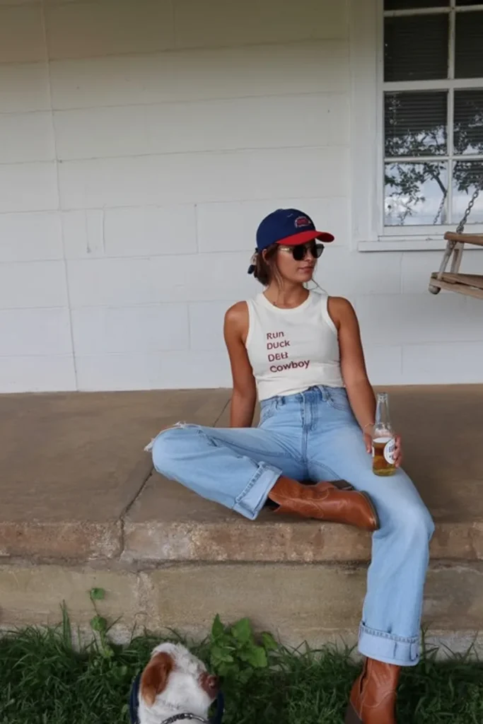 This outfit has personality from head to toe, and sometimes that is exactly what summer style needs. The graphic tank feels cheeky and confident, the relaxed jeans keep it grounded, and the cowboy boots give the whole look a little twist that makes it memorable. It is casual, cool, and unapologetically individual in a way that feels refreshing. Not every summer outfit needs to be floaty, floral, or sweet—sometimes you want something with a bit more edge, a little more humor, and a lot more attitude.