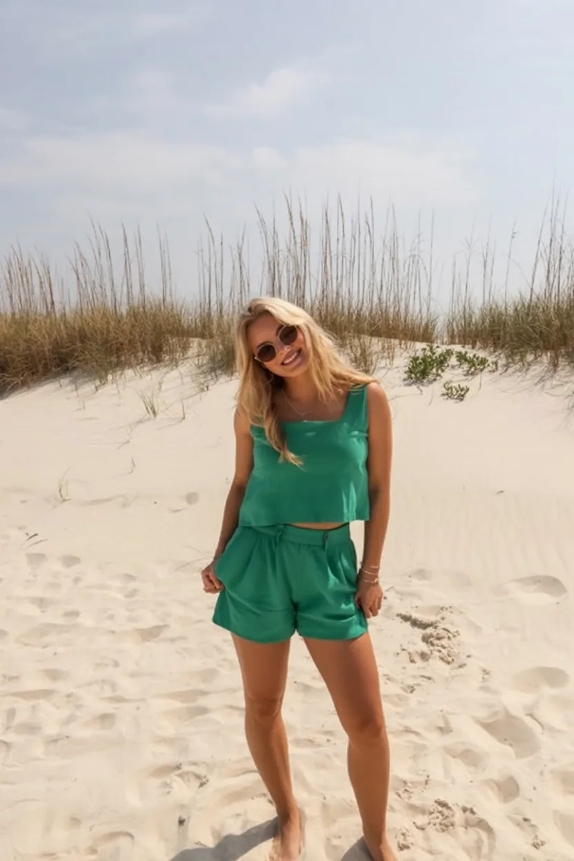 A matching shorts set like this feels like instant vacation mode. The bright green has such a fresh, happy energy, and the loose fit gives it that breezy confidence that works so well by the beach, at a resort, or even during a hot weekend at home. It is playful and relaxed but still pulled together enough that you do not feel like you are just wearing basics. That is really the sweet spot for summer clothes 2026—clothes that look intentional but still feel like you can breathe, move, and enjoy yourself in them.