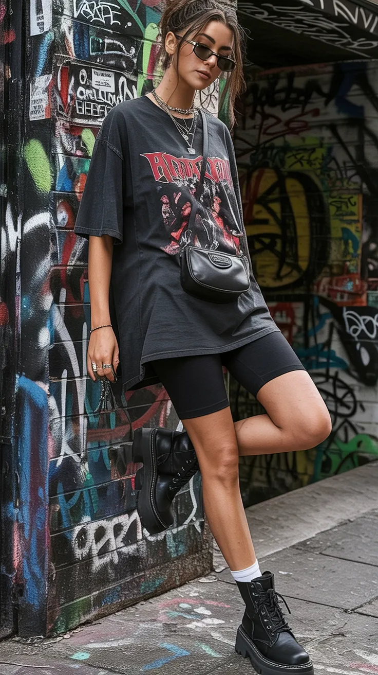 This look leans into that moodier side of summer style, and honestly, it works beautifully. The oversized vintage-style graphic tee paired with sleek biker shorts creates a silhouette that feels strong, modern, and just a little rebellious. There’s a downtown energy to it that makes the whole outfit feel cooler than your average hot-weather basics. The chunky boots keep it sharp, the little bag adds structure, and the sunglasses seal the deal. It’s one of those outfits that says you didn’t come to play small. It reads as streetwear with confidence, and it gives off that quiet kind of edge that always turns heads.