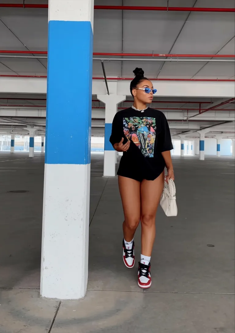 There’s something undeniably cool about an oversized black tee worn like it’s the whole point of the outfit. It feels relaxed, a little daring, and very confident without trying too hard. The statement sneakers and sharp accessories bring that punchy, editorial feel, while the overall shape stays simple enough to remain wearable. This is the kind of summer outfit that feels perfect when you want to look strong, modern, and just a bit untouchable. It carries that baddie energy, but in a way that still feels clean and balanced rather than overworked, which is exactly what makes it so appealing.