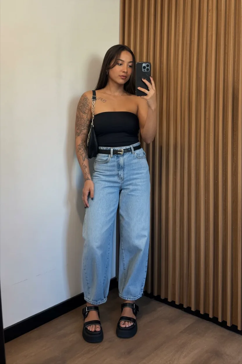 If your summer wardrobe usually swings between tiny shorts and breezy dresses, this is a beautiful middle ground. Wide-leg jeans offer more coverage and movement, while the strapless top keeps the outfit feeling fresh and seasonally right. For women who prefer polished minimal looks, this is a lovely option that still fits into the broader world of streetwear because of the relaxed denim and chunky sandals. It also feels especially current right now because simple silhouettes with strong proportions are having such a moment. A sleek bag and delicate jewelry are all you need to finish it.