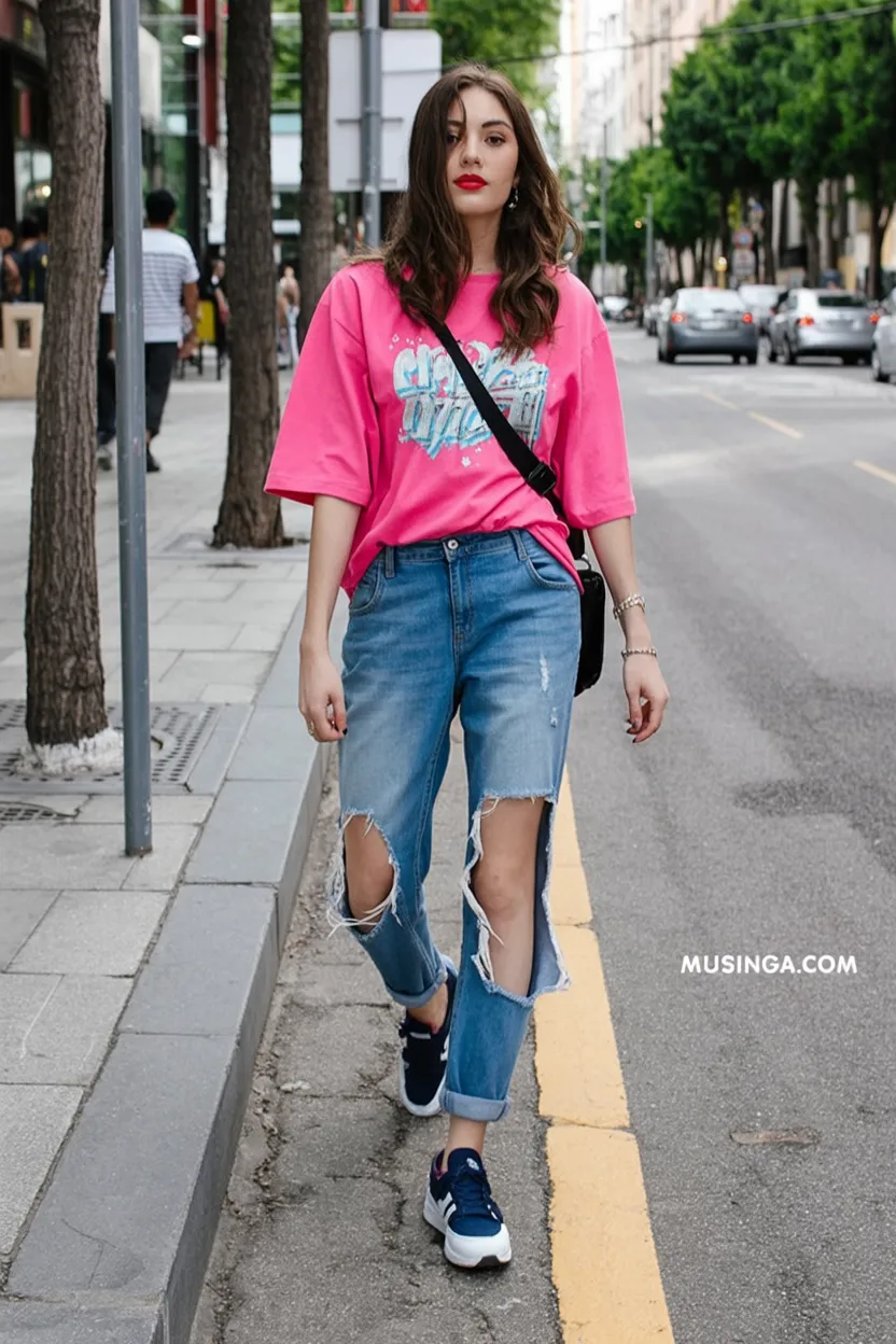 16. Pink Oversized Tee with Distressed Denim Jeans