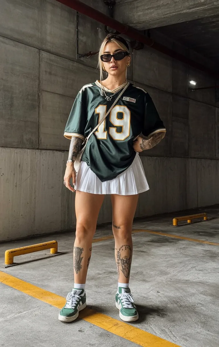 For women who want to try something outside the usual shorts-and-tee formula, this is a fun place to start. The oversized top keeps the outfit comfortable, while the pleated skirt brings shape and lightness. In 2026, sporty separates mixed with feminine pieces still feel very on trend because they create that effortless streetwear contrast people keep coming back to. This one works especially well with slick sunglasses, hoop earrings, and a glossy lip if you want to sharpen the whole mood. It’s cute, energetic, and unexpectedly wearable.