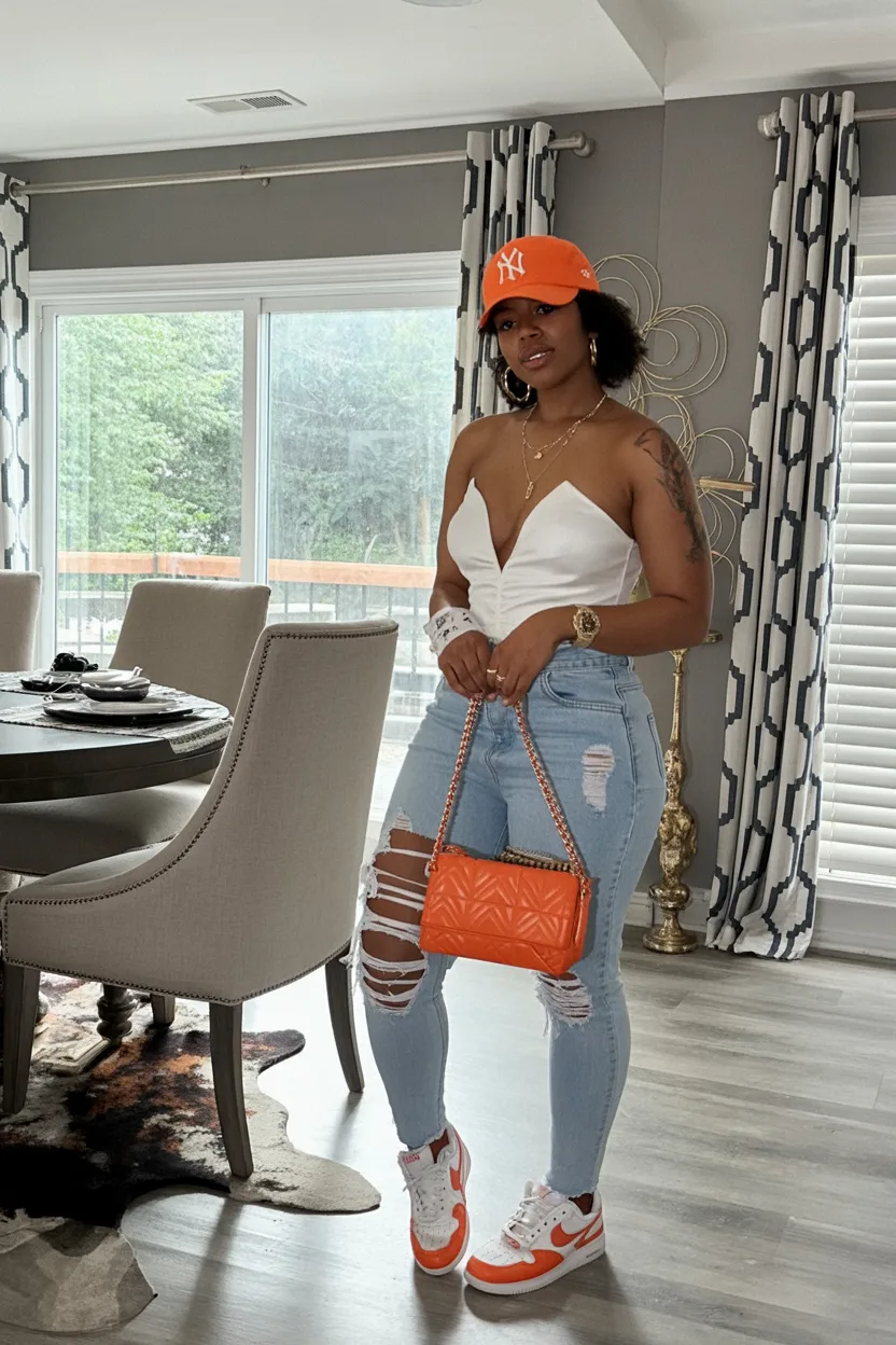 This is such a smart option for women who like fitted silhouettes but still want comfort and movement. The ripped jeans add texture and shape, while the bold orange accessories do all the heavy lifting, so you don’t need extra layers or complicated styling. It works beautifully for Black women who love color-coordinated details and sporty pieces with edge. A look like this feels especially current because statement sneakers and baseball caps keep pushing streetwear into more styled, grown-up territory. Keep your jewelry simple and let the orange accents carry the mood.