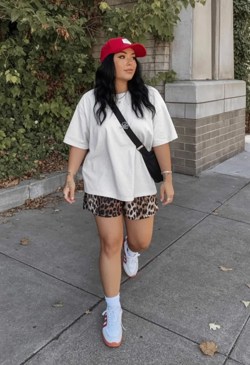 There’s something so satisfying about an outfit that looks effortless but still has plenty of personality. This one does exactly that. The oversized light tee gives that borrowed-from-the-boys ease, while the leopard shorts sneak in just enough attitude to keep things interesting. Add the red cap and sporty sneakers, and suddenly the whole outfit feels lively, confident, and ready to move. It’s the kind of summer look that works when you want comfort first but still want someone to notice that you clearly know what you’re doing. It has that relaxed street style charm that feels spontaneous in the best way.