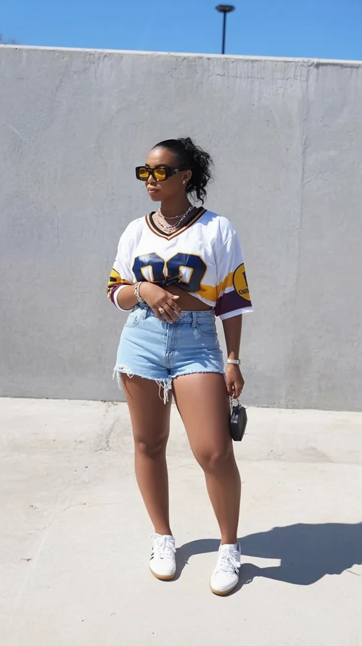 This is a great option for women who want a casual outfit with shape but still love comfort. High-waisted shorts work especially well if you like a bit more waist definition, and the looser top balances the silhouette beautifully. For 2026, sporty streetwear pieces like oversized jerseys are still going strong because they make everyday summer dressing feel fresh again. Finish it with crisp sneakers, a sleek ponytail, and simple accessories to keep the outfit polished instead of messy. It also works especially well for Black women who love bold, easy pieces with attitude.