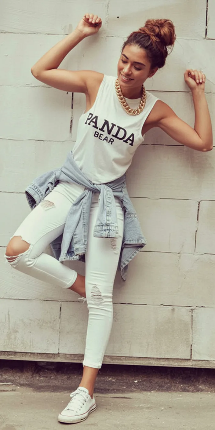 This outfit brings a lighter, brighter kind of swagger that feels so good in the heart of summer. The sleeveless graphic tank has just enough attitude, while the white ripped jeans make everything feel crisp, sunny, and pulled together. Then comes the denim jacket tied at the waist, which adds that casual finish that makes the whole look feel intentional rather than random. It has an upbeat, easygoing vibe that says you’re in a good mood and dressed like it. There’s a playful charm here, but it still feels grown-up enough to wear beyond your twenties without losing any of the fun.