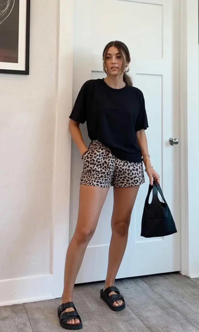 2. Leopard Shorts and Relaxed Tee Look