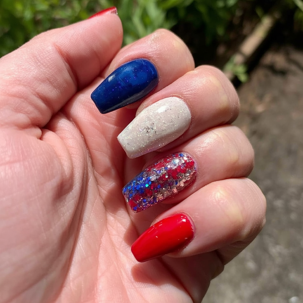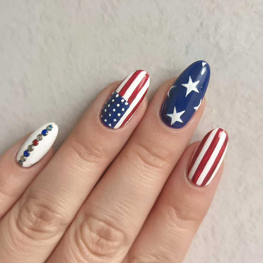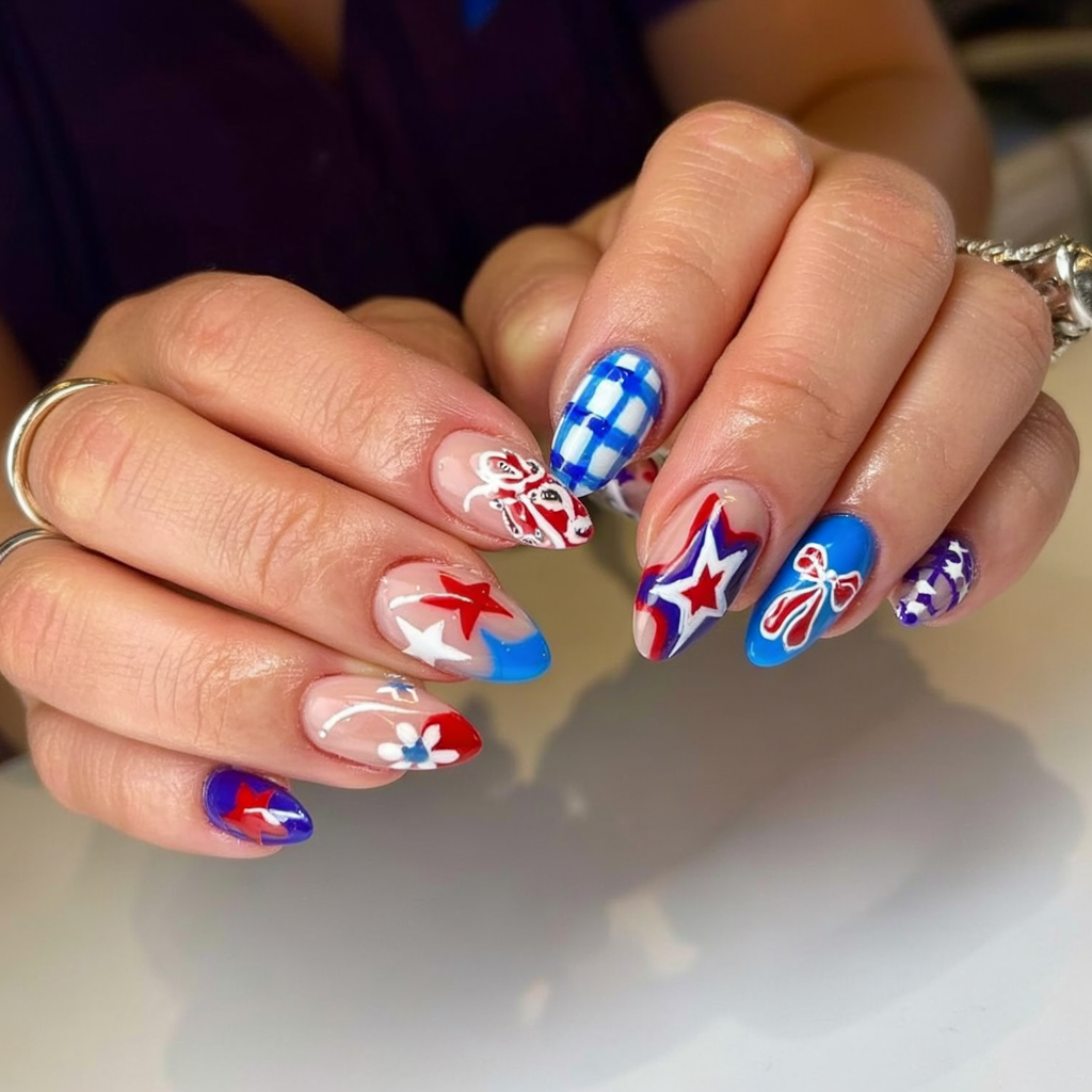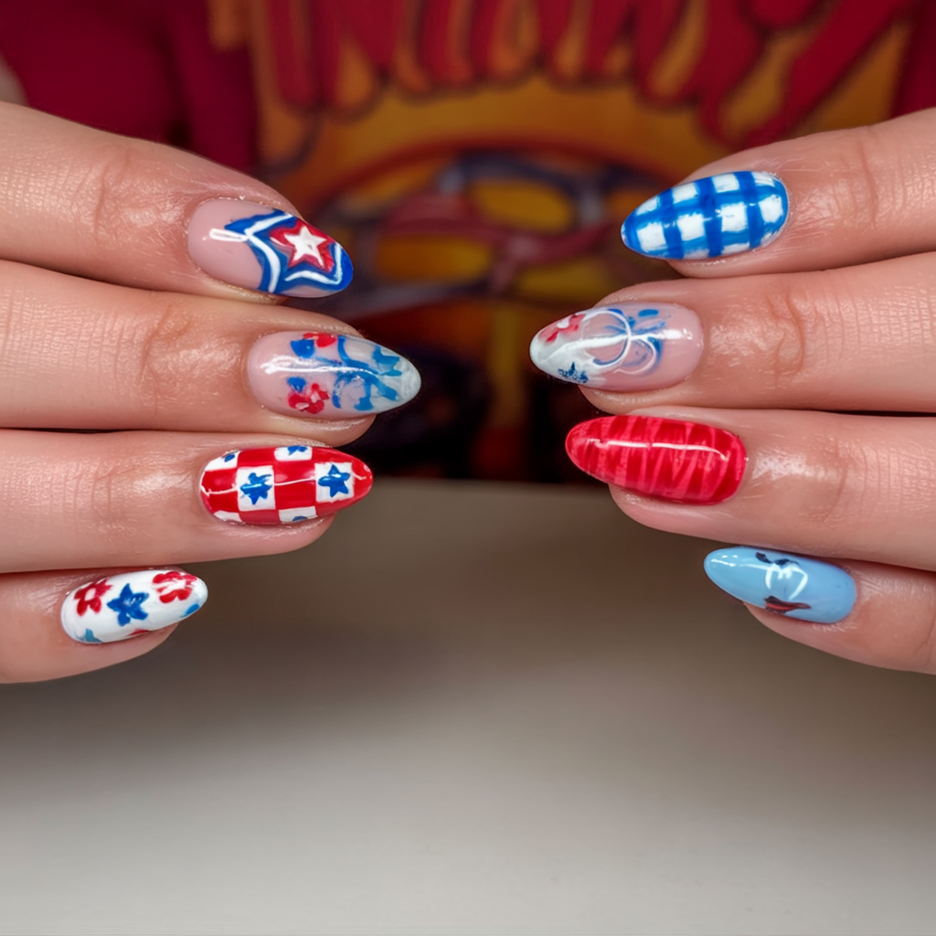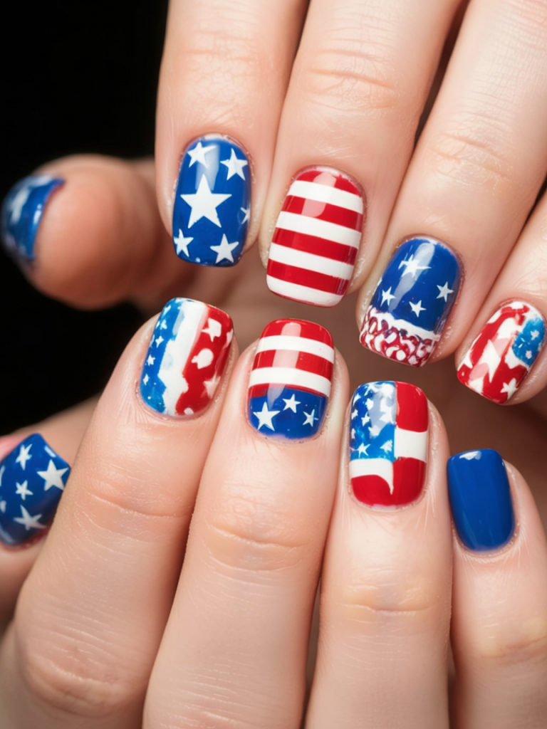 This vibrant set makes a bold statement with classic American flag elements—stars, stripes, and a whole lot of blue and red. Each nail design is slightly different, creating a patchwork quilt of patriotism. The nail type here leans toward short square acrylics, ideal for those who want durability without sacrificing style. There’s also a subtle bling accent incorporated into a couple of fingers, making it perfect for women who want something festive but still wearable for work or errands. Pair this look with denim shorts, a tied-up white blouse, and red lipstick for an effortlessly chic Americana ensemble.