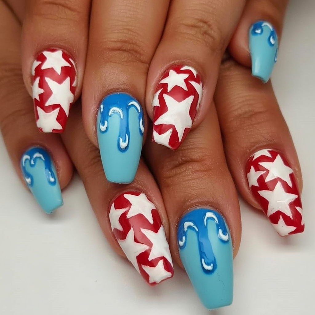 Channeling a funky retro vibe, this design stands out with chunky white stars on red and bold turquoise backgrounds, accented by blue drip-like curves. This playful style is ideal for design short nails and will totally pop at a music festival or beach day. Style tip? Add some jelly sandals and a 90s-inspired crossbody bag.